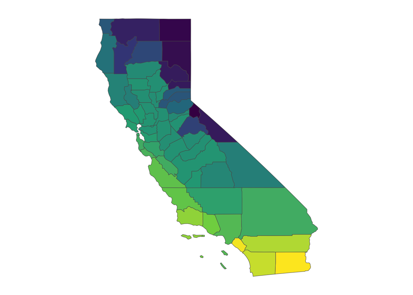 # Now use uncropped (and re-sampled) rasters to generate pop-weighted averages for all CA counties