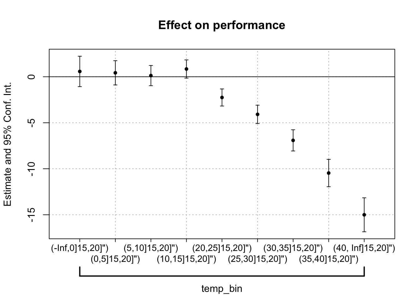 fit <- feols(performance ~ i(temp_bin, ref = "(15,20]") | group, data = data)
