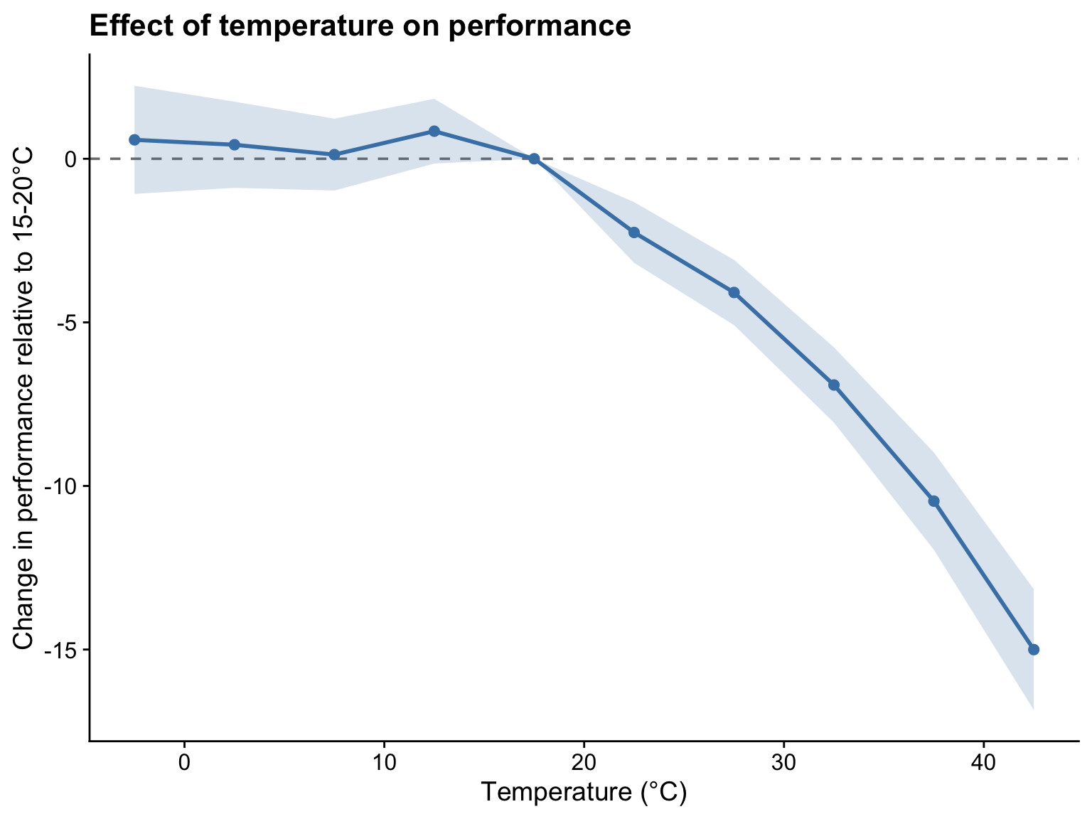 y = "Change in performance relative to 15-20°C",